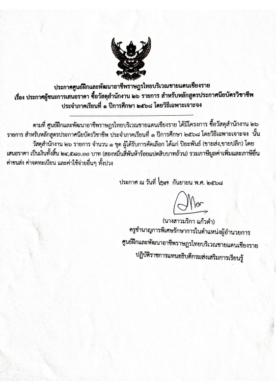 เรื่อง : ประกาศผู้ชนะการเสนอราคา ซื้อวัสดุสำนักงาน 26 รายการ สำหรับหลักสูตรประกาศนียบัตรวิชาชีพ ประจำภาคเรียนที่ 1 ปีการศึกษา 2568 โดยวิธีเฉพาะเจาะจง 23-09-2568 | เข้าอ่าน : 34 ครั้ง | ส่งบทความนี้ไปที่