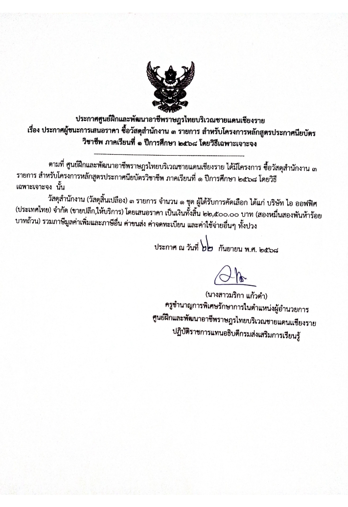 เรื่อง : ประกาศผู้ชนะการเสนอราคา ซื้อวัสดุสำนักงาน ซื้อวัสดุสำนักงานและวัสดุงานบ้านงานครัว 41 รายการ โดยวิธีเฉพาะเจาะจง 25-09-2568 | เข้าอ่าน : 32 ครั้ง | ส่งบทความนี้ไปที่