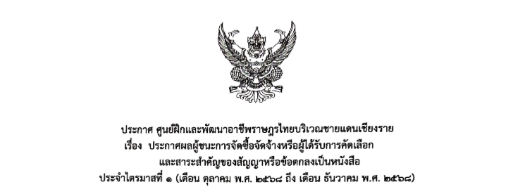 เรื่อง : ประกาศผลผู้ชนะการจัดจัดซื้อจัดจ้าง หรือผู้ได้รับการคัดเลือก และสาระสำคัญ และสาระสำคัญของสัญญาหรือข้อตกลงเป็นหนังสือประจำไตรมาสที่ 1 05-01-2569 | เข้าอ่าน : 36 ครั้ง | ส่งบทความนี้ไปที่